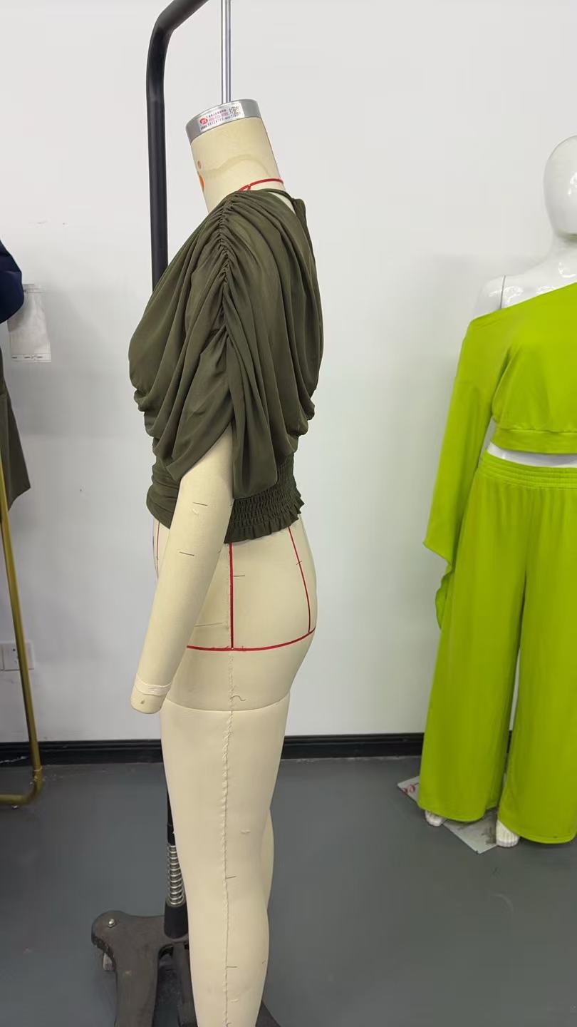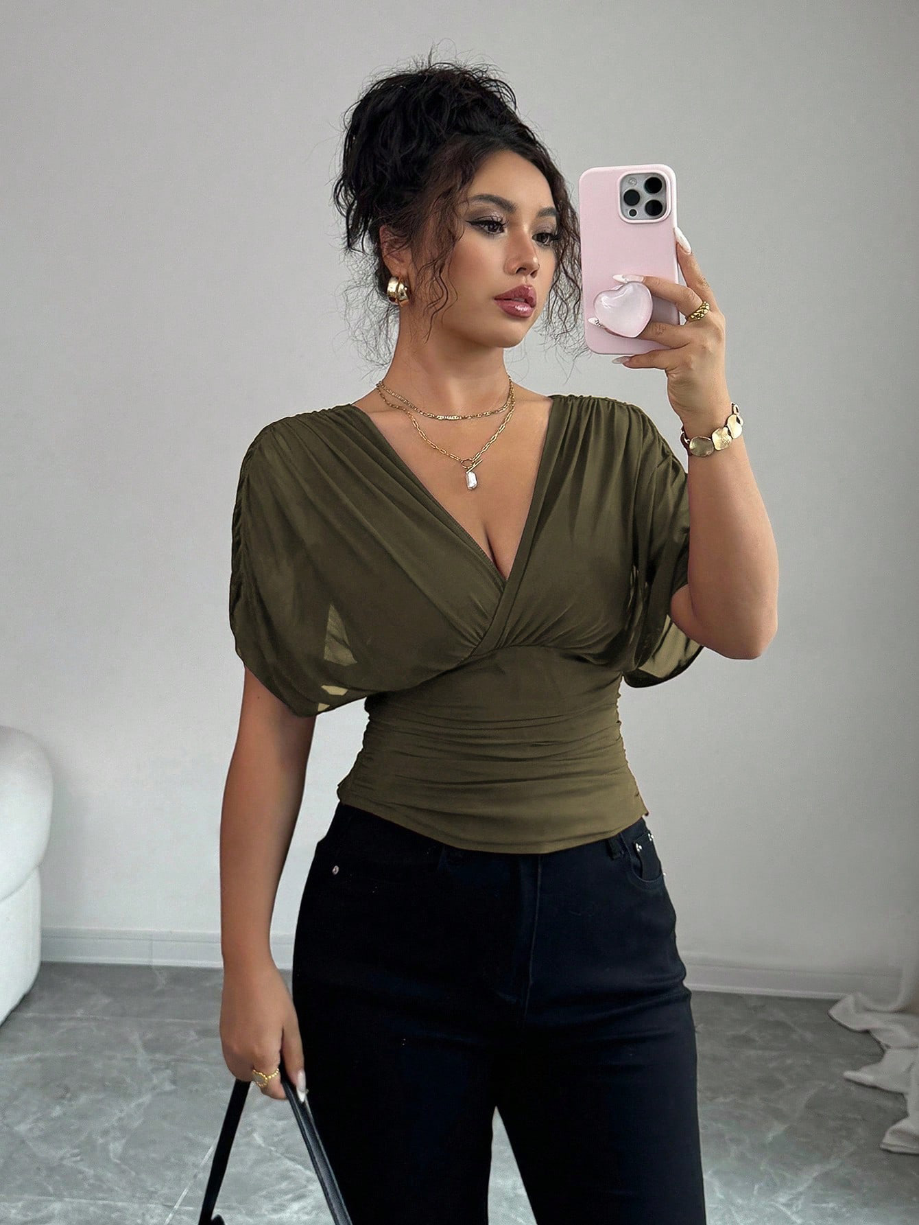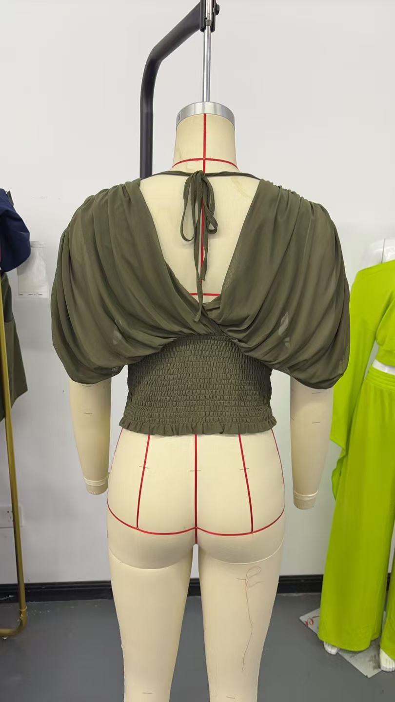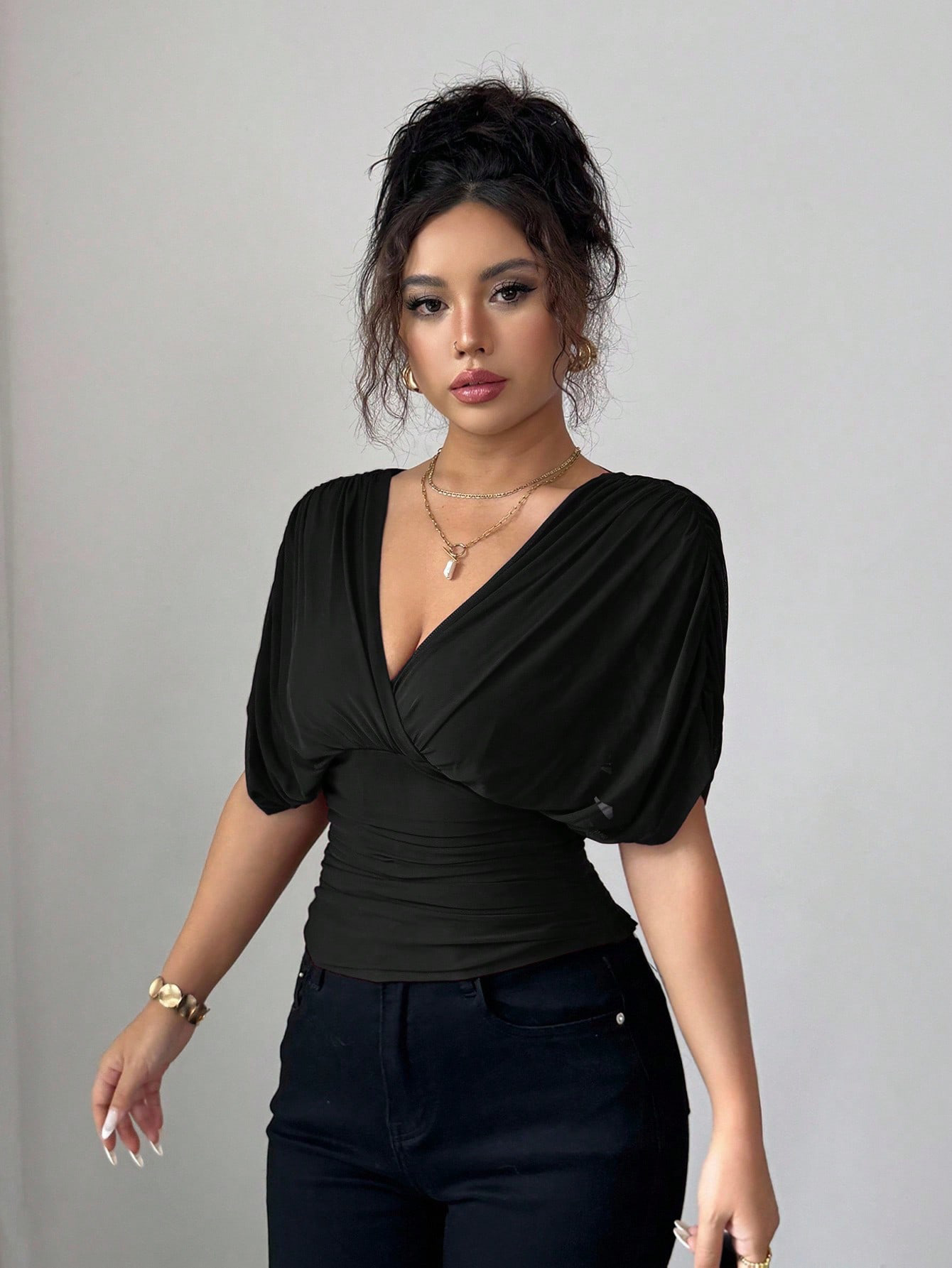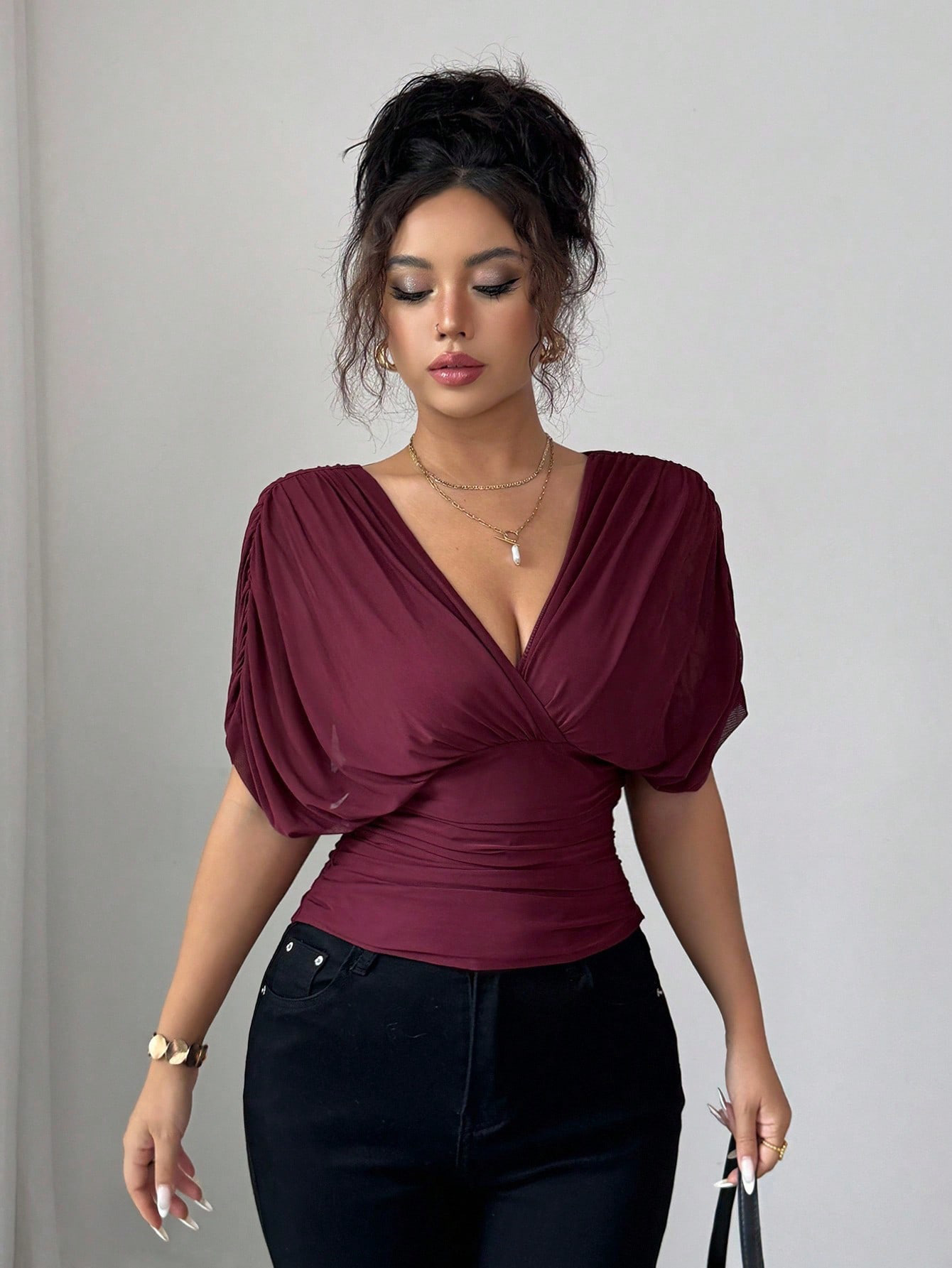 Solid-color Deep V-neck Short-sleeve Waist-cinching Top For Women