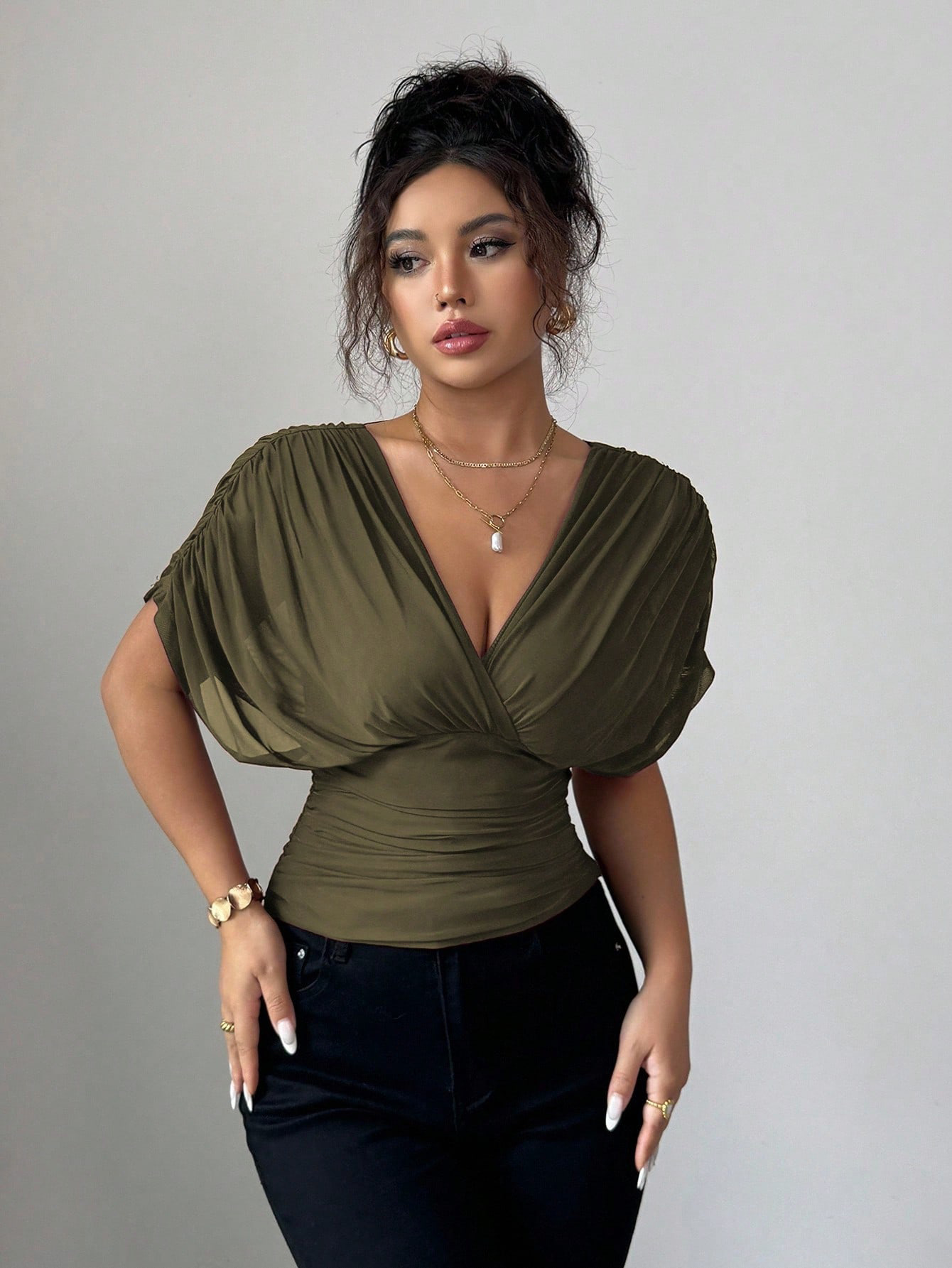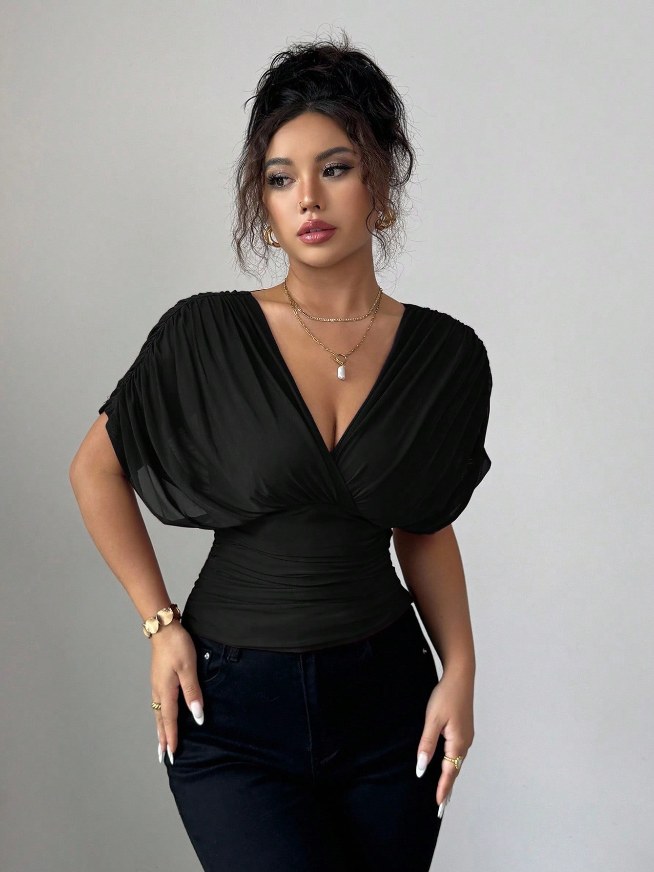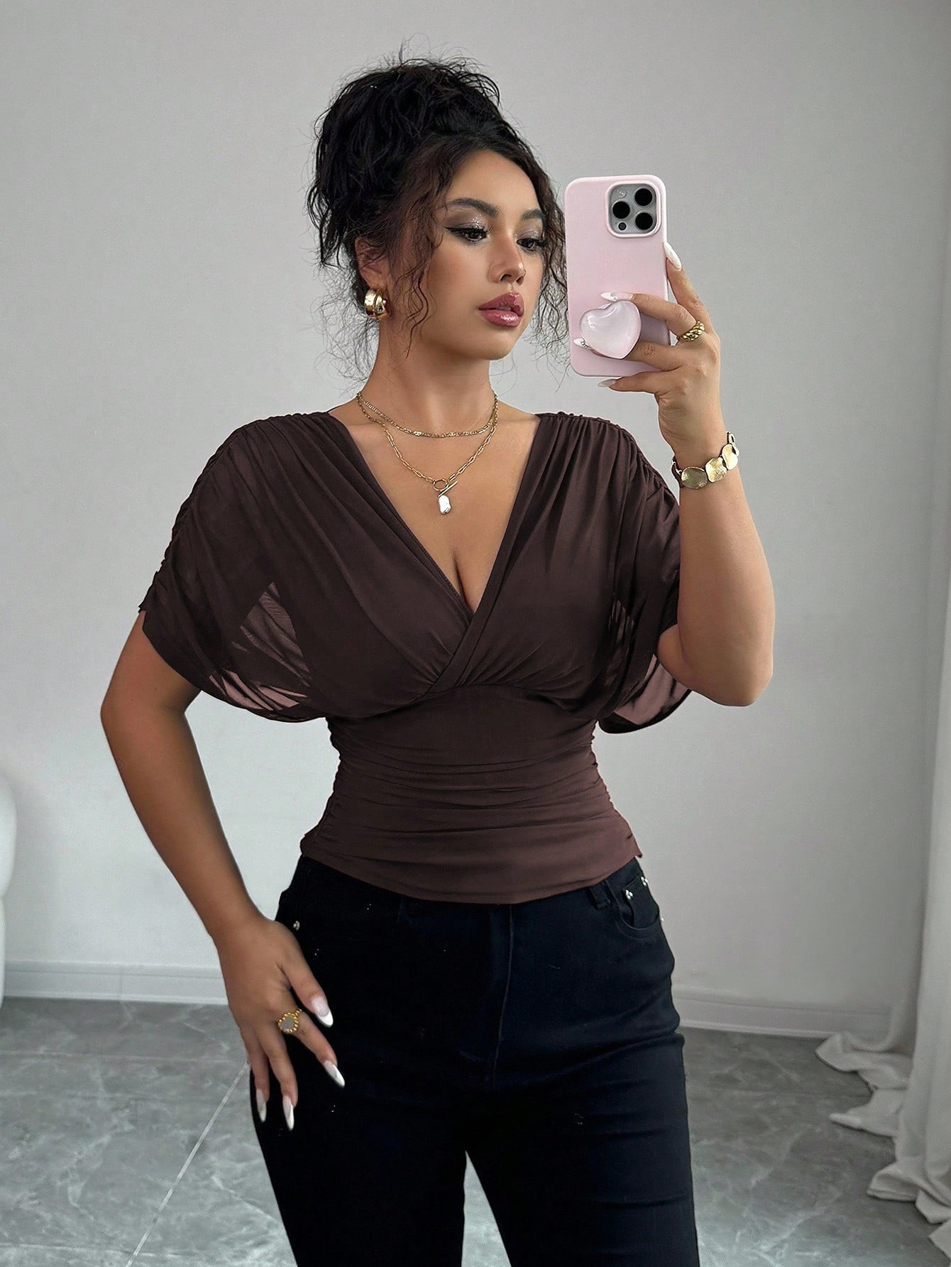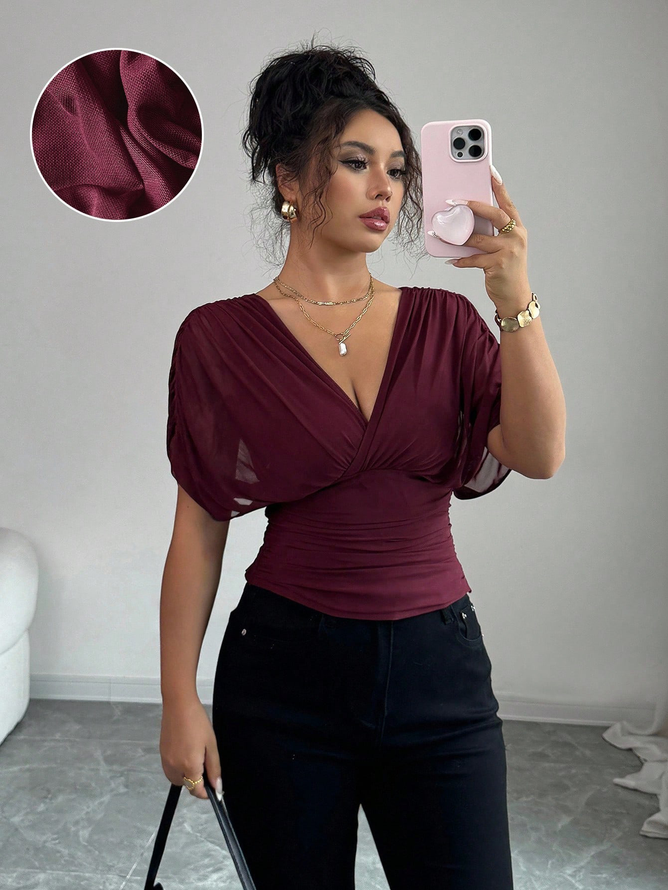 Solid-color Deep V-neck Short-sleeve Waist-cinching Top For Women